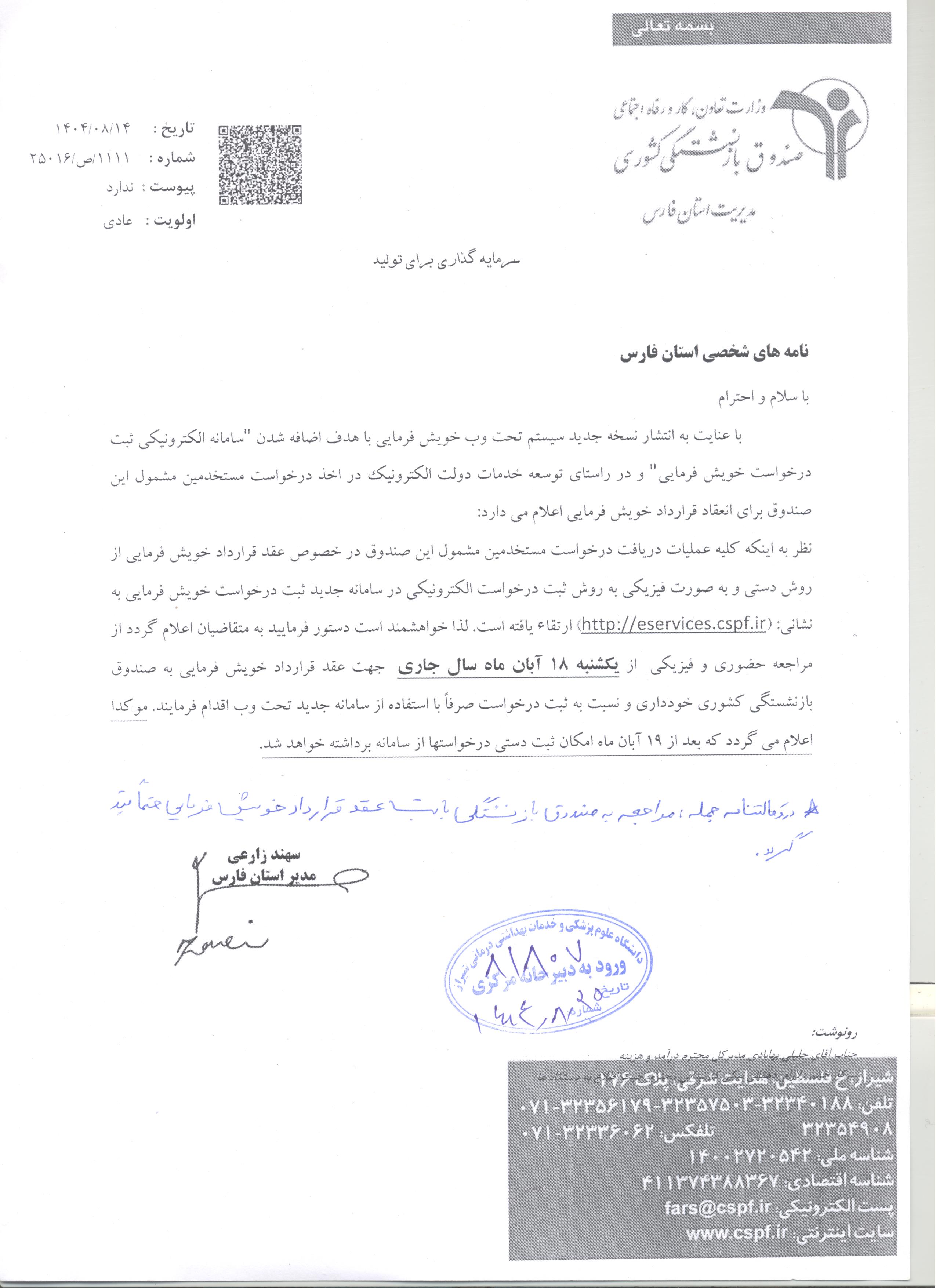 به پیوست نامه شماره 1111 / ص / 25016 به تاریخ 14 / 8 / 1404 صندوق بازنشستگی کشوری استان فارس در خصوص عقد قرارداد و پرداخت کسورات به صورت خویش فرمایی ارسال میگردد. خواهشمند است موضوع به نحو مقتضی به اطلاع کارمندان مشمول صندوق بازنشستگی کشوری که پس از خروج از خدمت یا مرخصی بدون حقوق تمایل به پرداخت کسورات به صورت خویش فرمایی دارند، رسانده شود.