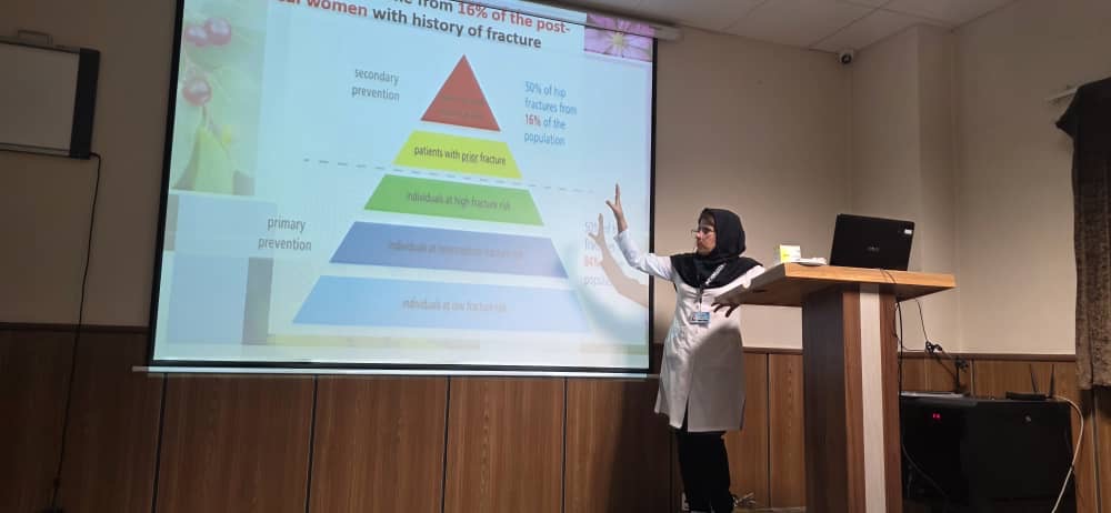 معرفی کلینیک استئوپاد ( شکستگی های ثانویه ) توسط خانم فولاد و ارائه مطالب آموزشی و مشاوره در خصوص نقش تغذیه در جلوگیری از پوکی استخوان توسط خانم دکتر احمدی و نقش ورزش و فعالیت های مناسب جهت پیشگیری از پوکی استخوان توسط آقای زرنگار